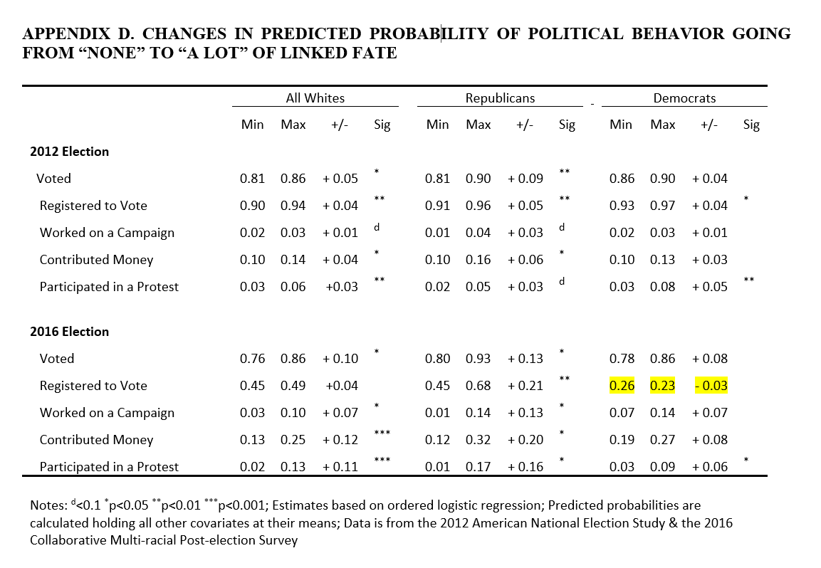 But the estimated effect for interest representation (Table 1) was -0.06 units among liberal White respondents (with a "+" indicator for statistical significance), which is the same reported number as the estimated effect for vote choice (Table A5): -0.06 units among liberal White respondents (with a "+" indicator for statistical significance).