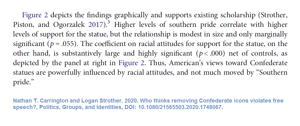 And did no one in the review process raise a concern about the Carrington and Strother 2020 suggestion below that White Southern pride requires or is nothing more than "pride in a failed rebellion whose stated purpose was the perpetuation of race-based chattel slavery" (p. 6)?