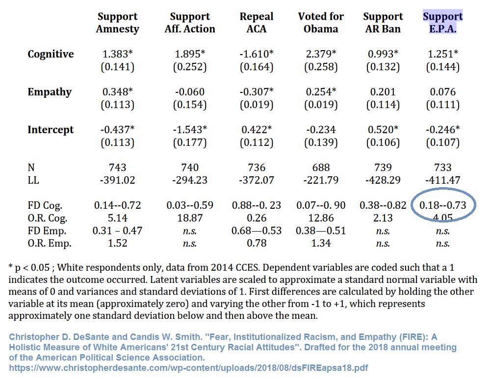 I have a paper and a blog post indicating that combinations of these items substantially associate with environmental policy preferences net of controls for demographics, partisanship, and political ideology. DeSante and Smith have a paper that reported an analysis that uses combinations of these items to predict an environmental policy preference ("Support E.P.A.", in Table 3 of the paper), but results for this outcome variable are not mentioned in the DeSante and Smith 2020 PS publication. DeSante and Smith 2020 reports results for the four FIRE racial attitudes items separately, so I will do so below for environmental policy preference outcome variables, using data from the 2016 Cooperative Congressional Election Study (CCES).