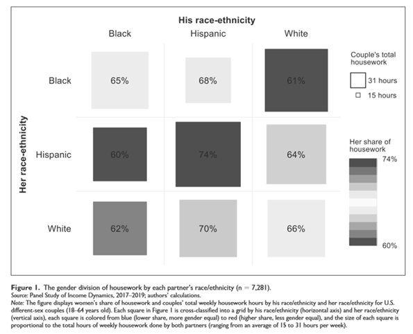 Don’t communicate information in color that will not be communicated in grayscale. For example, the color plot is from Pessim and Pojman 2022 “Visualizing Racial-Ethnic Differences in the Division of Housework among Different-Sex Couples in the United States”:
