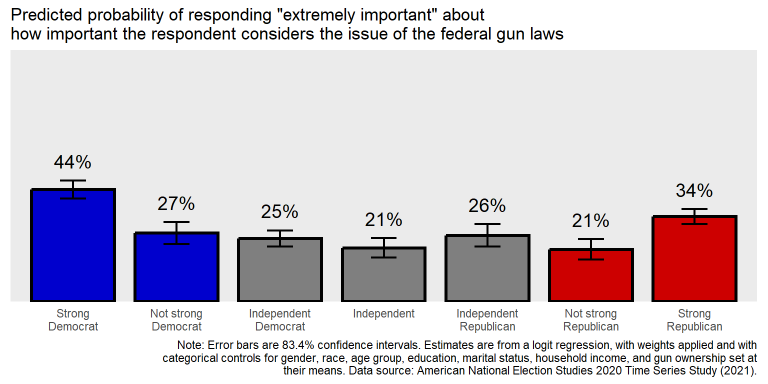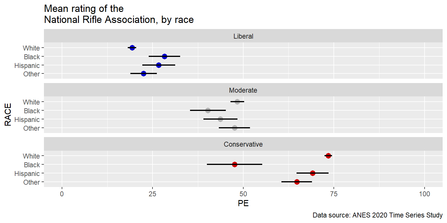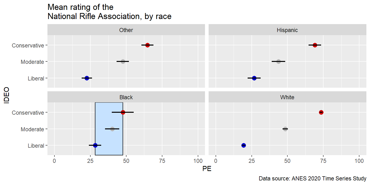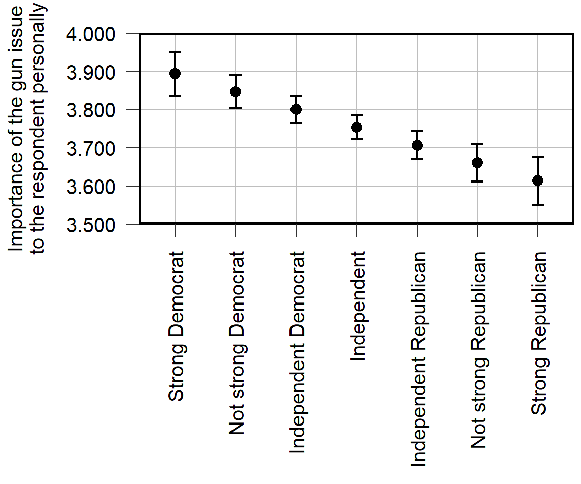 Use measures and scales that communicate substantive sizes. For the plot, the point estimate is about 3.9 for strong liberals and about 3.6 for strong conservatives. Is that a large difference? The plot isn’t clear what the scale is, so it’s not clear how much the plotted difference matters.