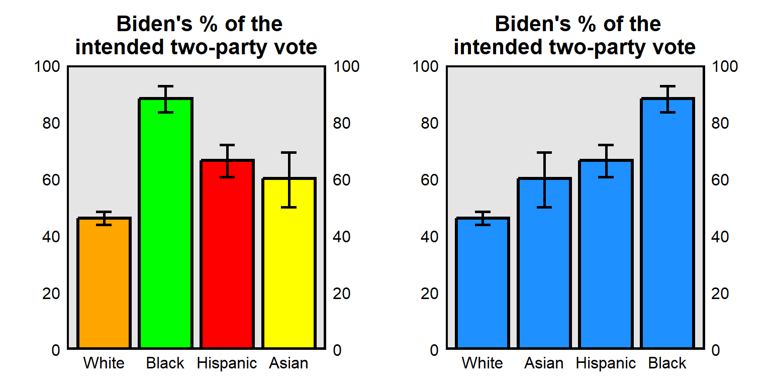 - Consider whether color helps interpretation. For example, the left plot below has a different color for each column, along with a label for each column. Such redundancy is not necessarily bad and can help interpretation if the color is intuitive, such as for U.S. politics using blue for Democrats and red for Republicans. But in the plot below the colors do not correspond intuitively to race, so the color can make the plot more difficult to process. (The plot to the right below standardizes the color and orders the columns from low to high, which can also help interpretation of the plot.)