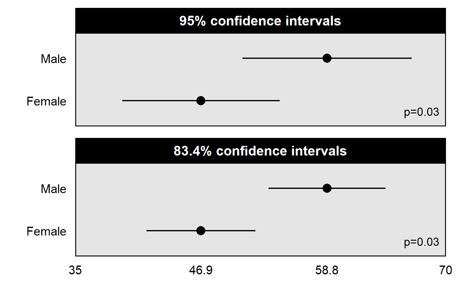83.4% confidence intervals are better for assessing whether there is sufficient evidence at p=0.05 that one estimate differs from another estimate. In the plot above, the p-value is p=0.03 for a test of whether the mean estimate among males differs from the mean estimate among females. The 83.4% confidence intervals not overlapping each other indicates that the p-value is less than p=0.05 for a test of whether those estimates differ from each other. But the 95% confidence intervals overlapping a lot with each other isn’t as useful for helping us assess whether the mean estimate among males differs at p<0.05 from the mean estimate among females.