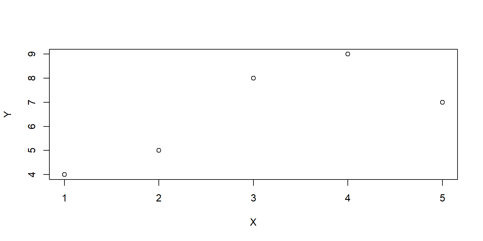 Let’s get data for two variables: X and Y. Let’s use the combine function c to combine numbers, and then let’s use the assign function <- to assign those numbers to X and Y. Then let’s plot a scatterplot of X and Y:
