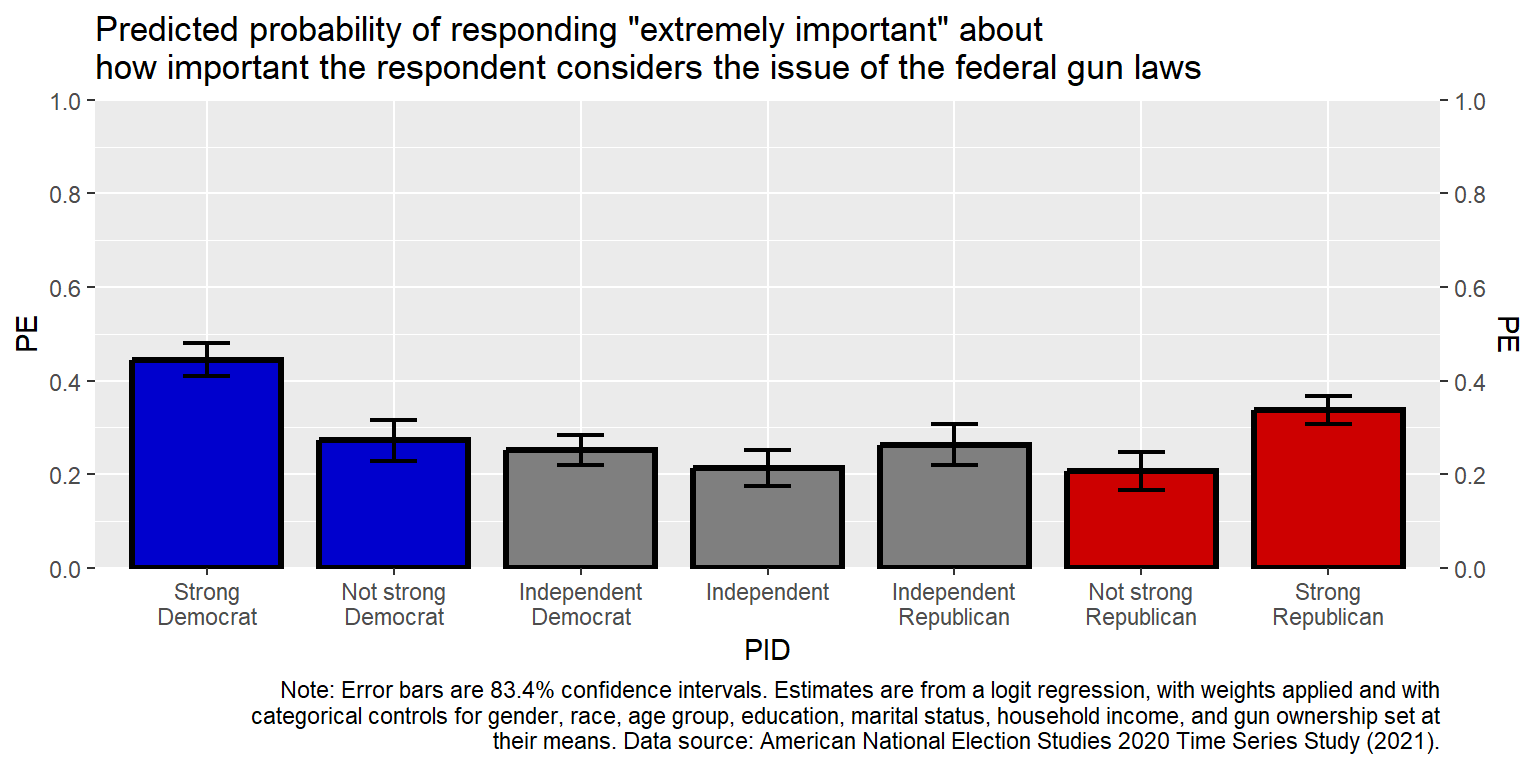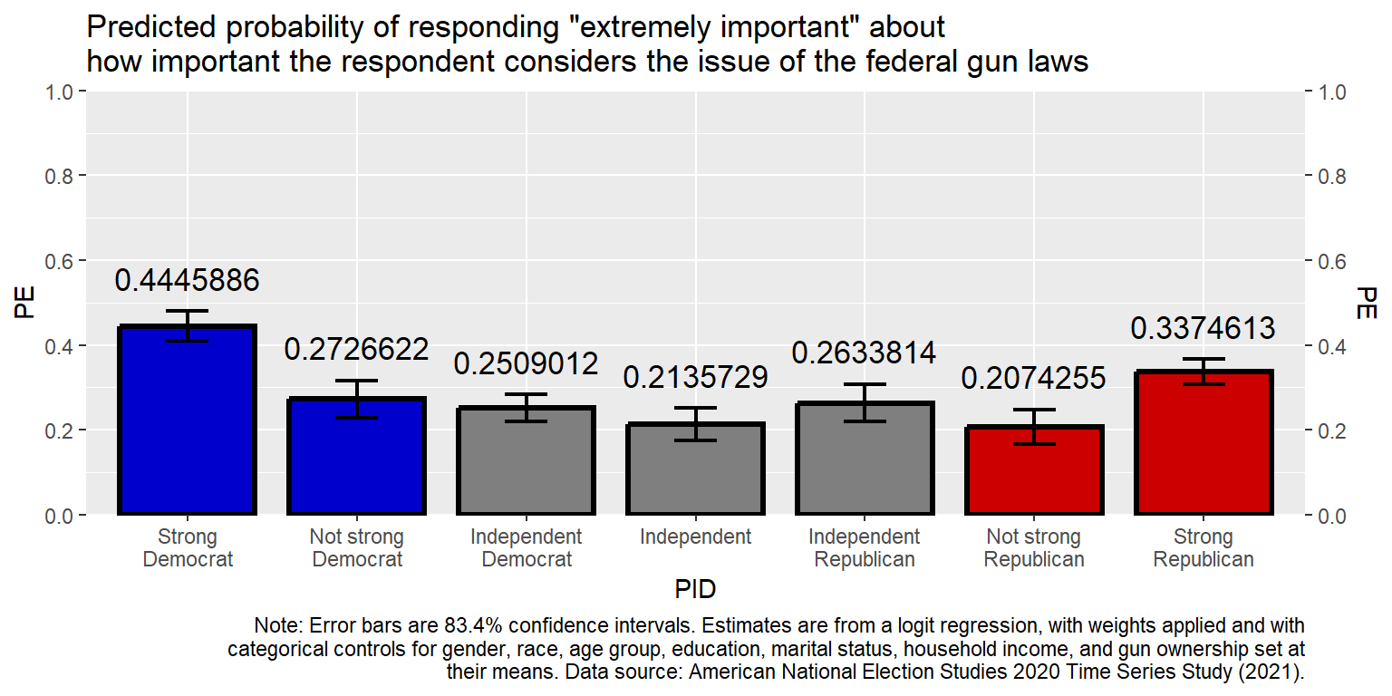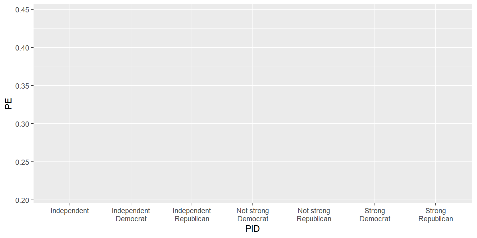 Let’s get data that we can plot. One way to get data into R is through a tribble function from the tidyverse package. The setup of the tribble function is to use a tilde (~) to indicate column headers and then indicate the data in the columns. The tribble code below has four columns: PID (for party identification), PE (a point estimate “best guess” for the observed frequency, which in this case is the predicted probability of a respondent selecting “extremely important” to indicate how important the respondent considers the issue of the federal gun laws), and CILO and CIHI (respectively, the low end and high end of confidence intervals that provide an estimate of the uncertainty in the point estimate). The assignment operator <- assigns these data to a dataset called GUNIMP.