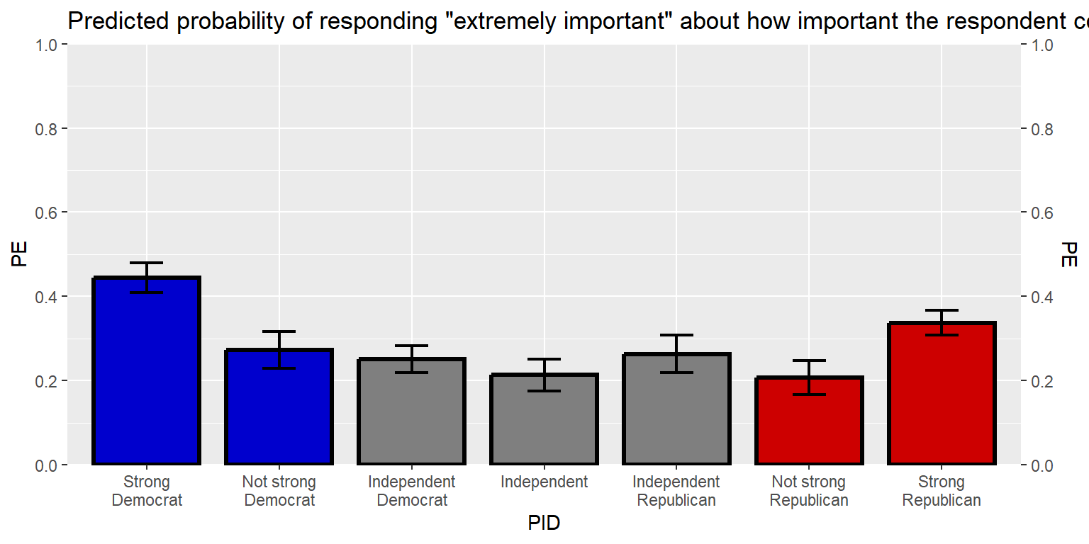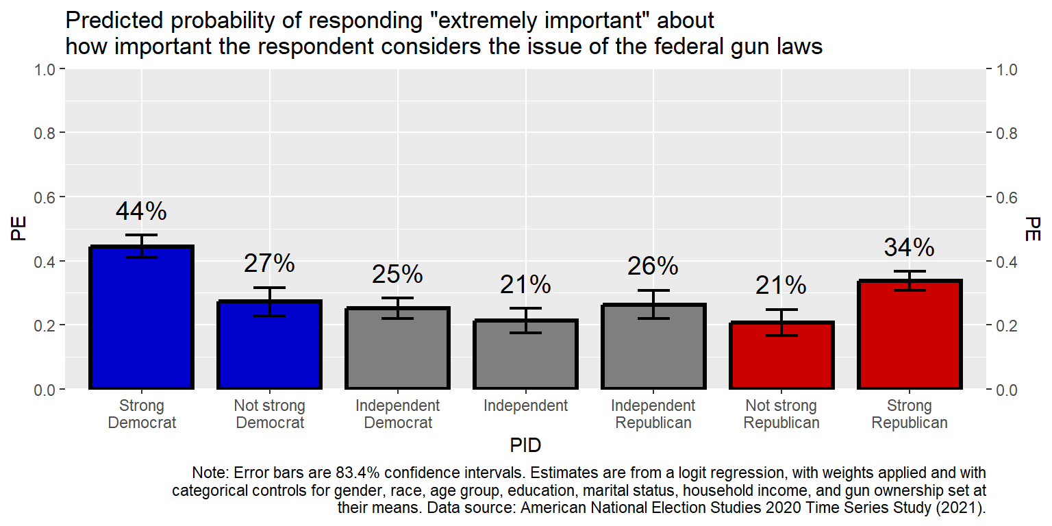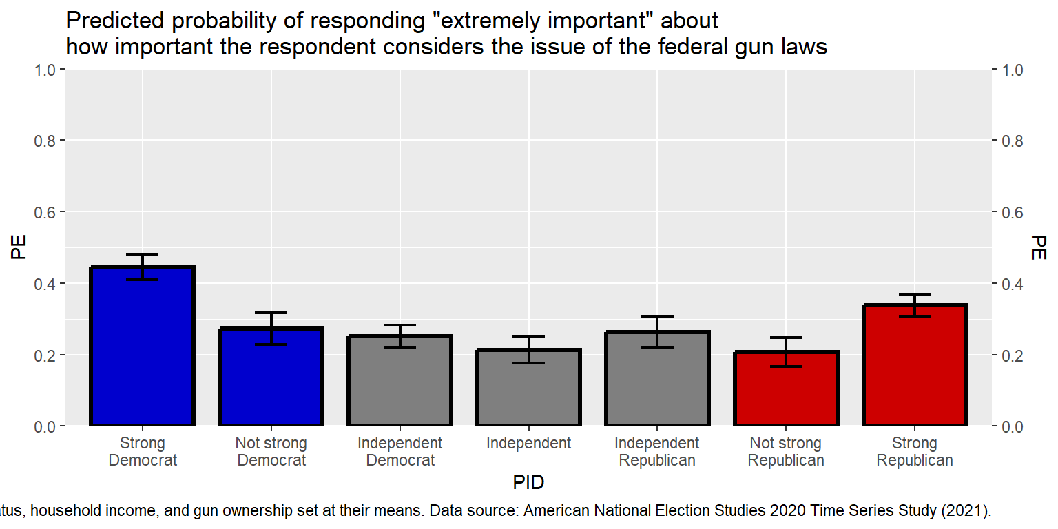 Let’s get data that we can plot. One way to get data into R is through a tribble function from the tidyverse package. The setup of the tribble function is to use a tilde (~) to indicate column headers and then indicate the data in the columns. The tribble code below has four columns: PID (for party identification), PE (a point estimate “best guess” for the observed frequency, which in this case is the predicted probability of a respondent selecting “extremely important” to indicate how important the respondent considers the issue of the federal gun laws), and CILO and CIHI (respectively, the low end and high end of confidence intervals that provide an estimate of the uncertainty in the point estimate). The assignment operator <- assigns these data to a dataset called GUNIMP.