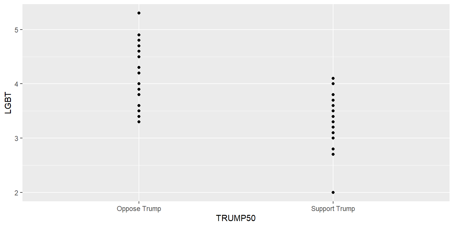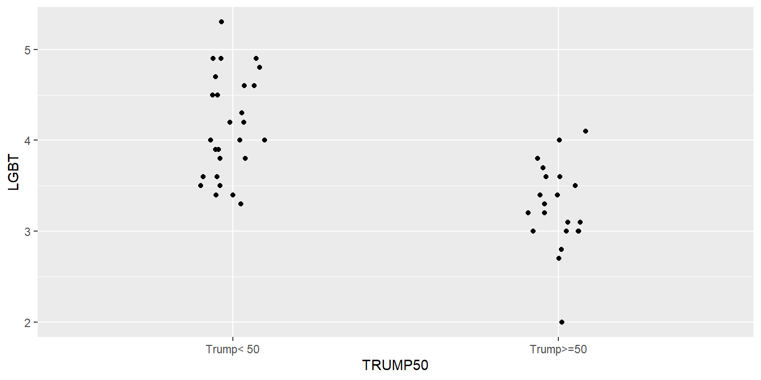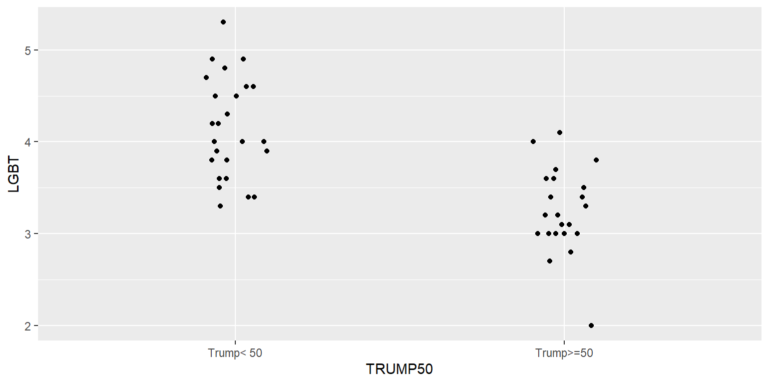Let’s plot on the y-axis the percentage LGBT in a state and on the x-axis whether at least half of votes in the state went to Donald Trump in the 2016 U.S. presidential election.