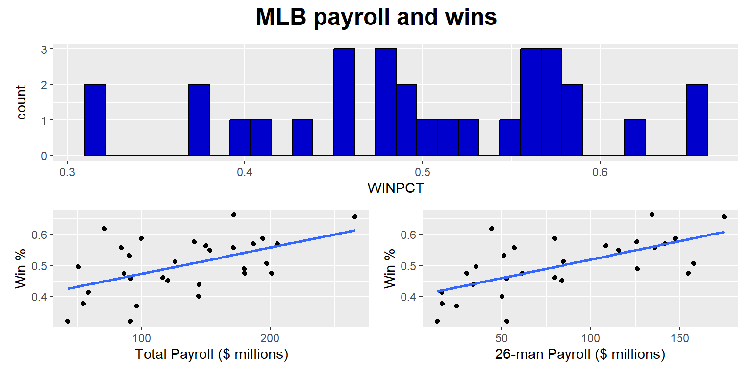 labs(x="Total Payroll ($ millions)", y="Win %")