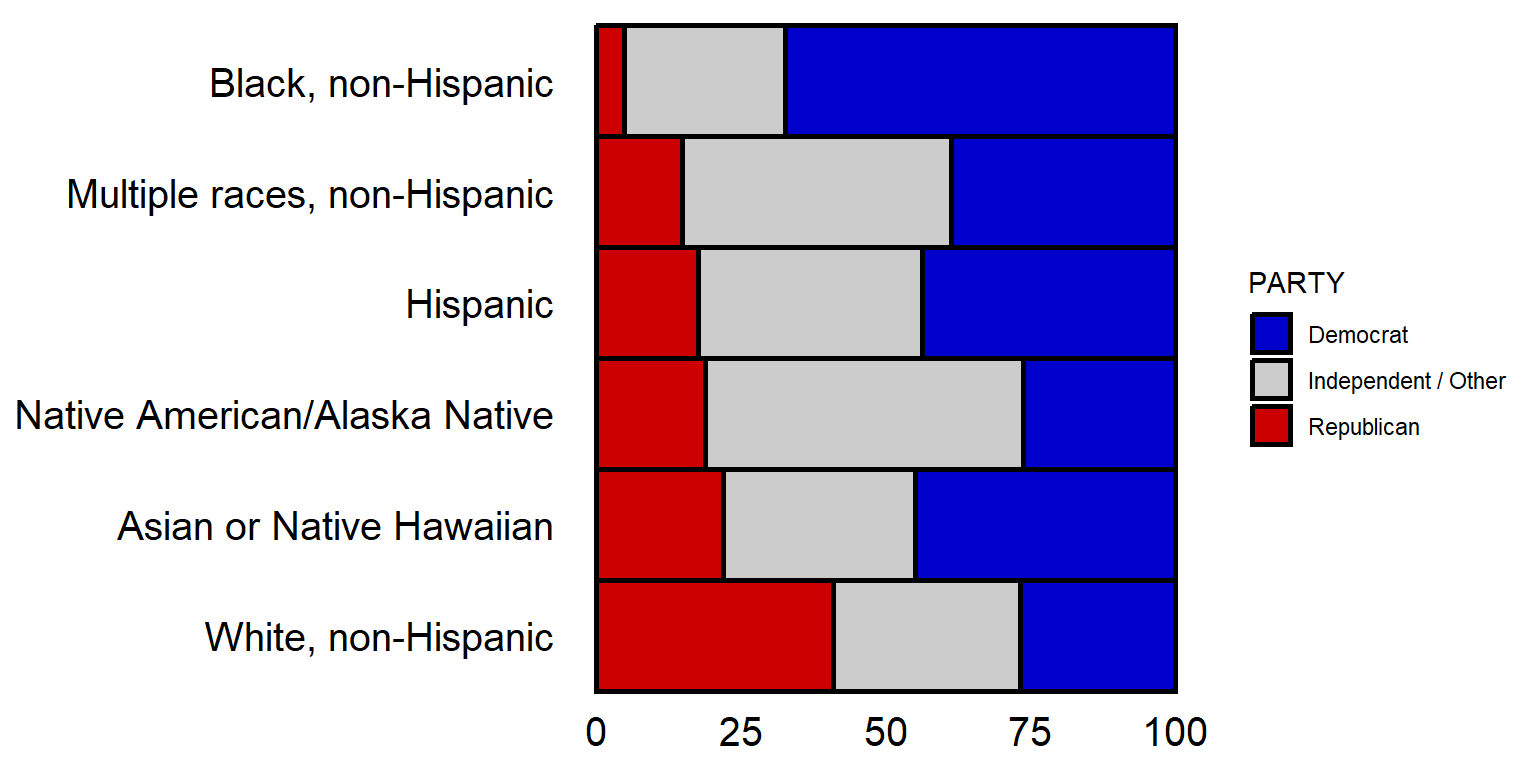 By the way, the above plot has the plot region range from Democrat > Independent > Republican, but has the reverse order for the legend. Can you figure out how to get the left-to-right order for the plot region to be the same as the left-to-right order for the legend?