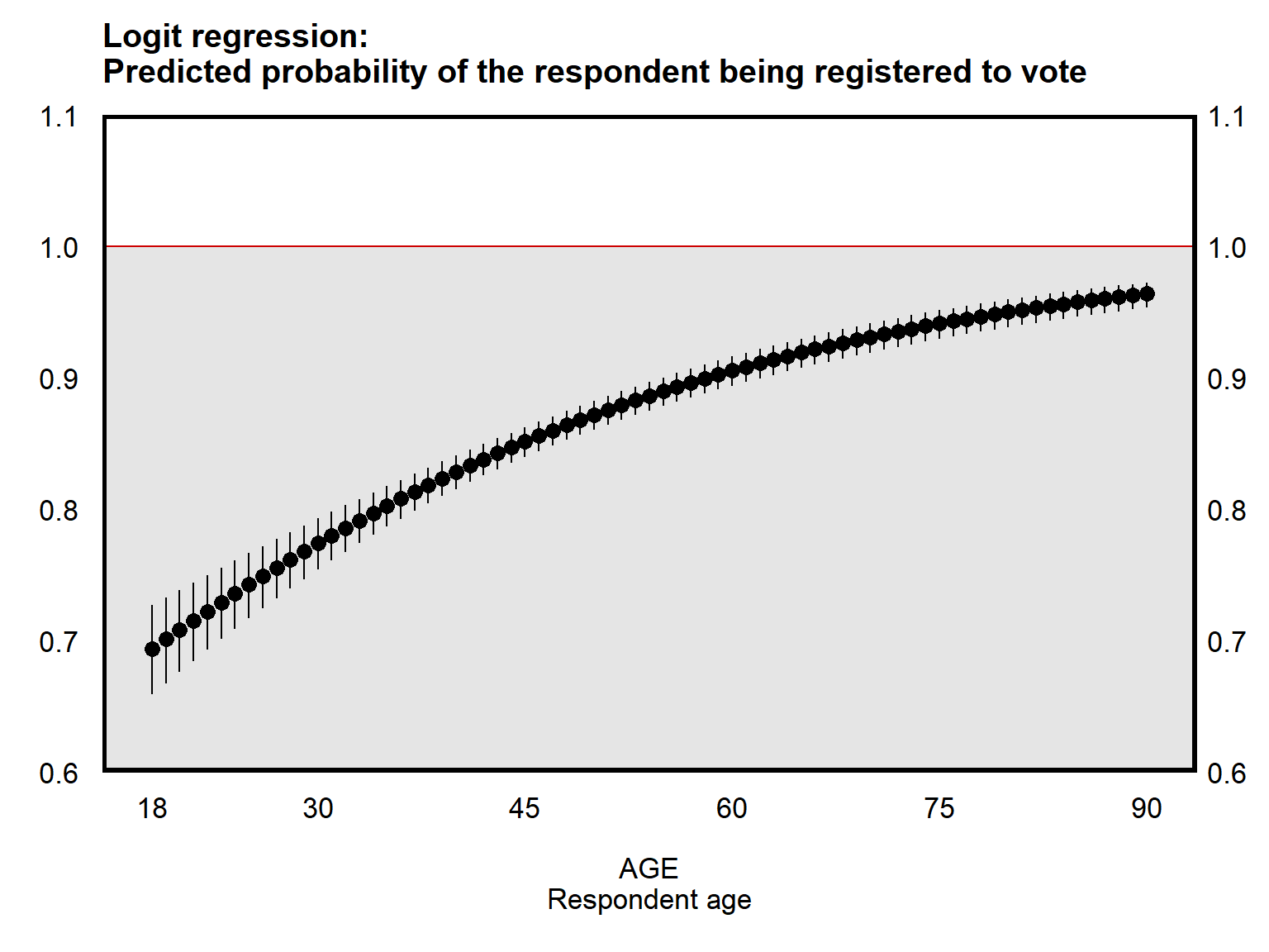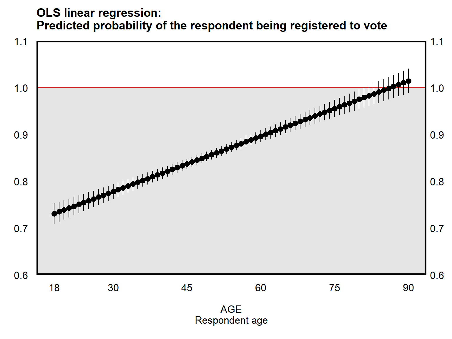 The plot below used a linear regression to get estimates of the predicted probability that the respondent reported being registered to vote. This is called the linear probability model, because the model predicts probabilities using a linear regression. One shortcoming of the linear probability model is that the linear probability model can produce predictions that are impossible, such as a 90-year-old respondent respondent having a predicted probability of being registered to vote that is greater than 100%.