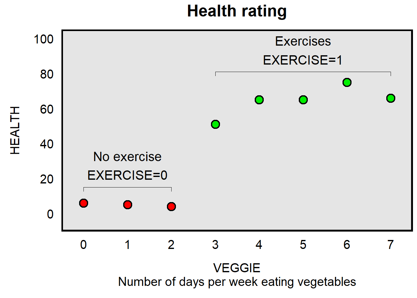 Let’s use a visual example. The plot below presents data for eight persons. The x-axis is a variable called VEGGIE, which indicates how many days per week that each of the eight persons eats vegetables, the y-axis is HEALTH, which indicates a rating about how healthy the person is, and the color of the dots indicates whether the person exercises, with a red dot indicating that the person does not exercise and a green dot indicating that the person exercises (with a variable called EXERCISE).