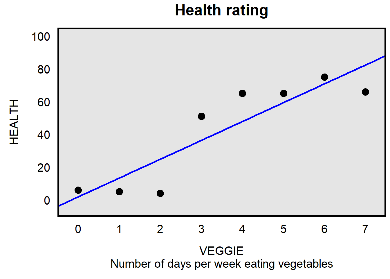 One way to model the association between VEGGIE and HEALTH is to merely draw a line of best fit through all of the points, like below, and to not incorporate information from the EXERCISE variable.