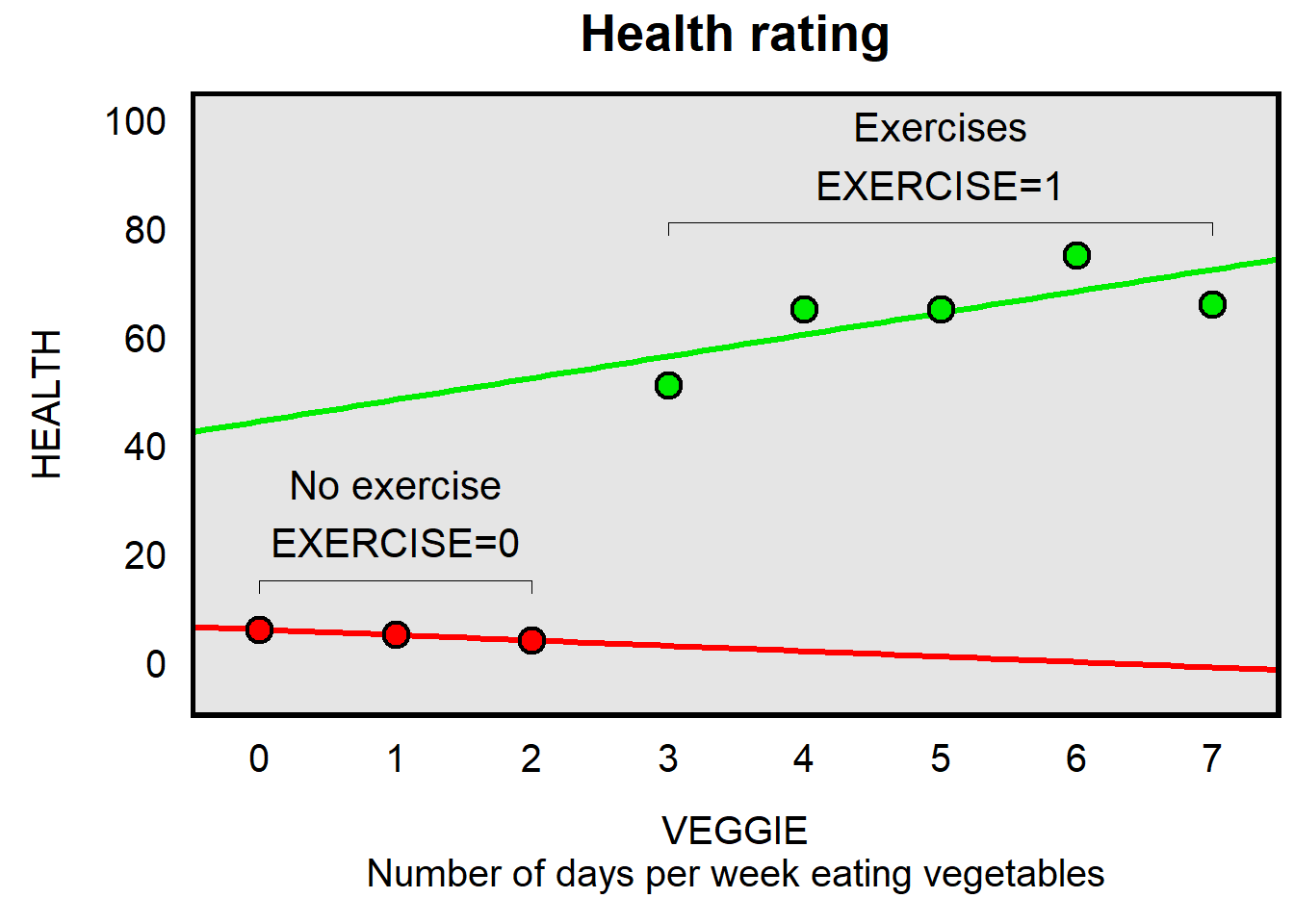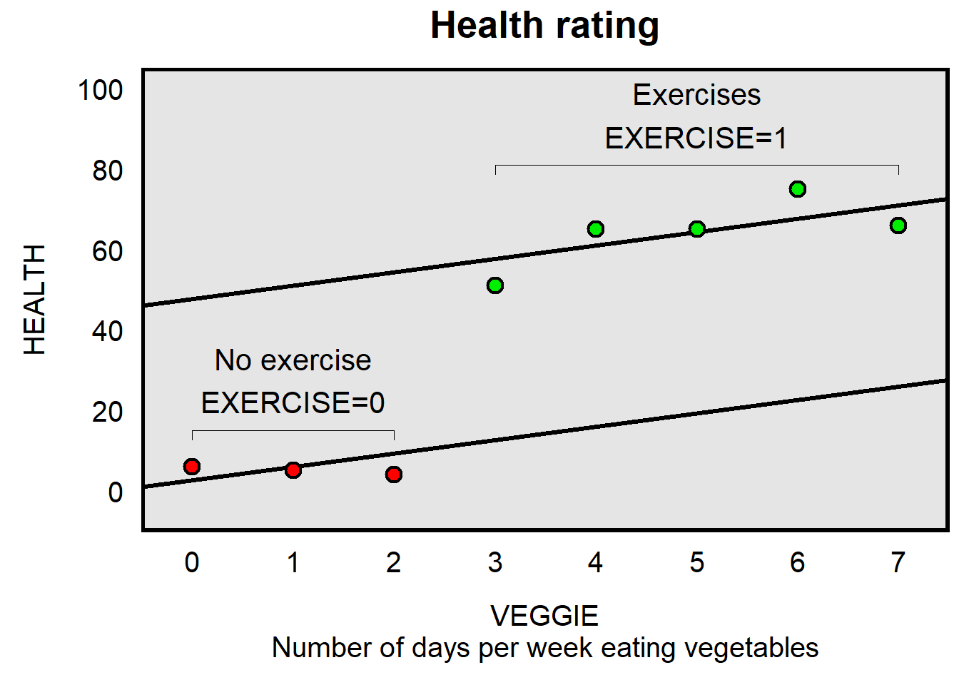 Another way to model the association between VEGGIE and HEALTH is to draw a line of best fit through all of the points, but to control for whether a person exercises. This line of best fit has the same slope, regardless of whether a person exercises or does not exercise, but the height of the line of best fit depends on whether a person exercises or does not exercise. For this equation, there is one slope for VEGGIE, but the predicted outcome of HEALTH also depends on whether EXERCISE is coded 1 or 0.