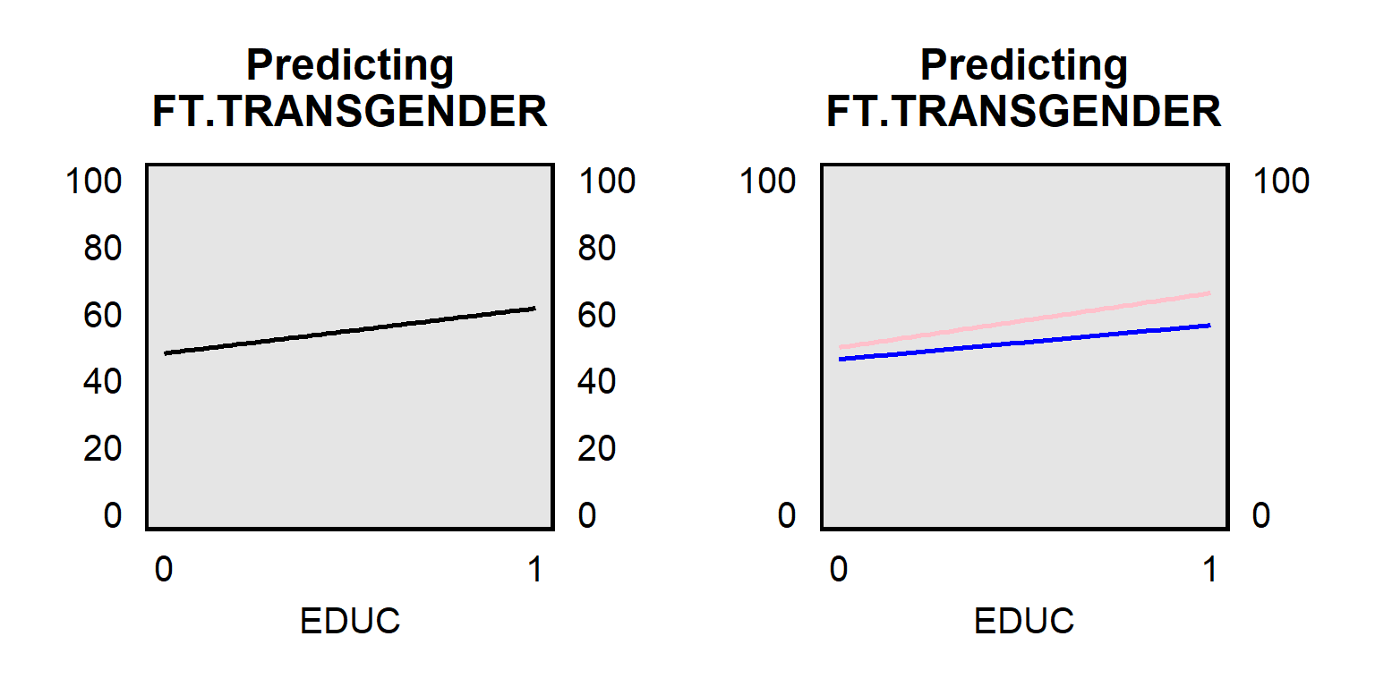 Let’s check data from the ANES 2016 Time Series Study for the association between an outcome of respondent feeling thermometer ratings about transgender persons (FT.TRANSGENDER) coded from 0 for very cold to 100 for very warm and a predictor of respondent education (EDUC), coded 0 for less than a high school education, 0.2 for a high school education, 0.4 for some college, 0.6 for a two year associate’s degree, 0.8 for a four-year bachelor’s degree, and 1 for a post-graduate degree. The panel on the left below plots the association between FT.TRANSGENDER and EDUC among all respondents, and the panel on the right below plots the association between FT.TRANSGENDER and EDUC among female respondents (top pink line) and among male respondents (bottom blue line). The slope for female respondents differs from the slope for male respondents, indicating that gender is a moderator between FT.TRANSGENDER and EDUC.