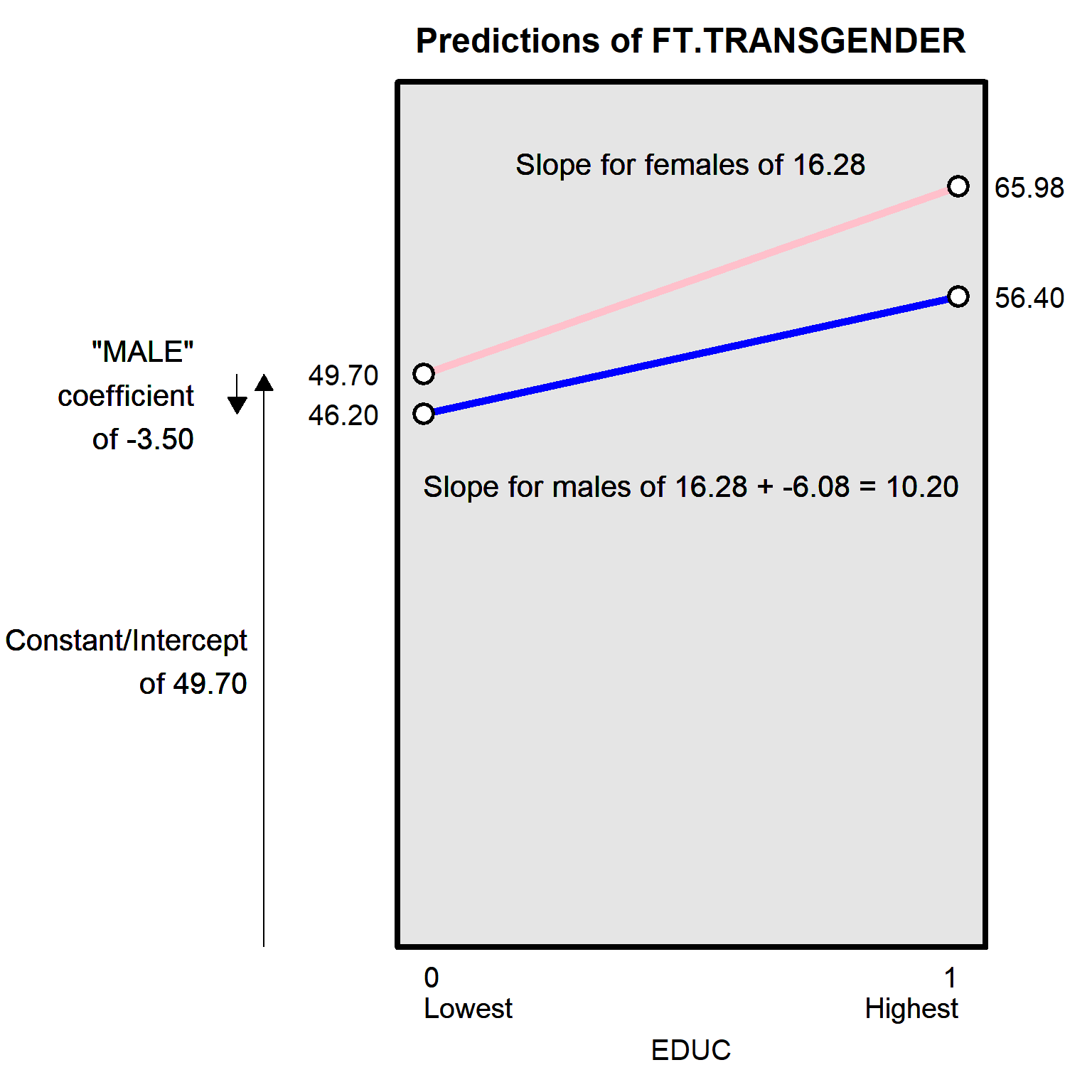 ------------------------------------------------------------------------------Let’s discuss the remainder of the coefficients estimates in the interaction regression. The individual predictors that make up the interaction term are called constituent terms (or constitutive terms). These constituent terms are interpreted with the other terms in the interaction set to zero. So the coefficient of 16.28 for the EDUC constituent term indicates that the estimated effect of education is 16.28 when MALE is set to zero. In other words, 16.28 is the predicted change in the FTTRANSGENDER outcome among female respondents, given a one-unit change in EDUC.