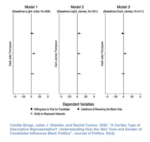 “…that the perceived discrimination and other lived experiences of dark-skinned Black candidates leads them to be preferable to Black voters who want descriptive representatives who understand and can address the needs of the racial group”.