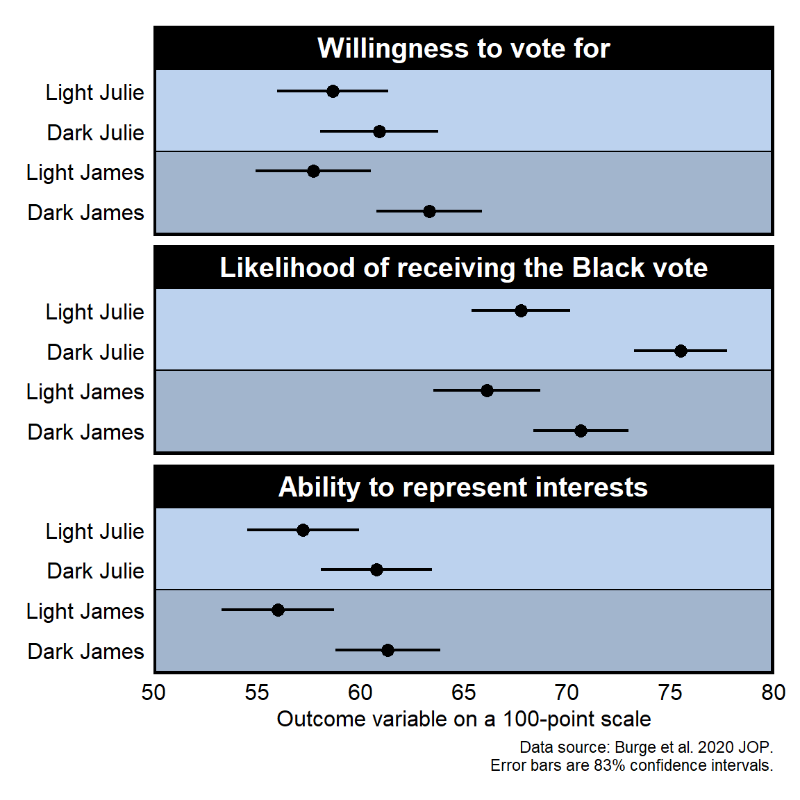 [Don’t worry about this for now, but I’m putting this here as a reminder for me to discuss this in class] Burge et al. 2020 (p. 1598) indicates that the p-value is p<.05 for Figure 1 and Figure 3. However, the 95% confidence intervals overlap in Figure 1 and Figure 3. If the 95% confidence intervals overlap, is it possible that the p-value is p<.05 for a test of the null hypothesis that the mean for the light-skinned candidate differs from the mean for the dark-skinned candidate? See the output below for Figure 1, based on Burge et al. 2020 code:
