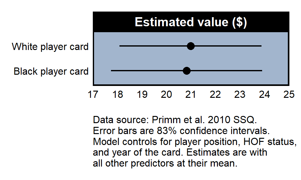 [misc] The Race predictor in Model 4 does not have a p-value under p=0.05 and thus is not statistically significant, which means that the analysis does not permit us to conclude that the mean logged card value for Black players differed net of controls from the mean logged card value for White players. This is a null result, but null results can be classified as informative or uninformative, in which an informative null result permits us to conclude that, even if there is an effect, the effect is small. For example, the p-value is not under p=0.05 if a coin lands on heads 3 times in 4 flips (an uninformative null) and is not under p=0.05 if a coin lands on heads 4,999 times in 10,000 flips (an informative null). Does Primm et al. 2010 permit us to conclude whether the null is informative? If not, what information could Primm et al. 2010 have provided to permit us to assess whether the null is informative?