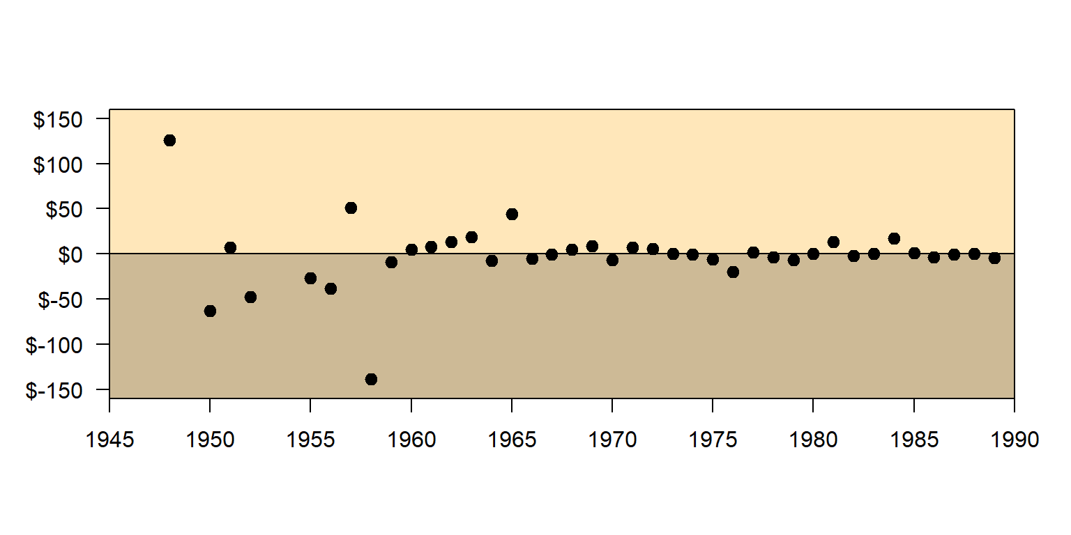 The first dot on the left indicates that, in that year, White players’ cards are on average worth about $120 more than Black players’ cards. The next dot to the right indicates that, in the next year, White players’ cards are on average worth about $65 less than Black players’ cards. Over time, there is not much relationship between the race of the player and card value, when controlling for year of the card.