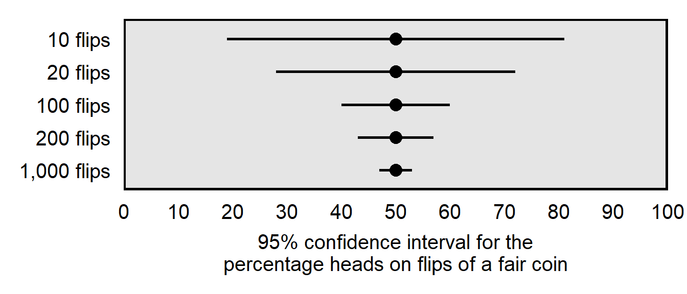Notice that, in terms of reducing the width of the 95% confidence interval, adding 10 flips to 10 flips was more useful than adding 100 flips to 100 flips. This reflects the fact that, as sample size increases, a extra observation is not as useful as prior observations have been.