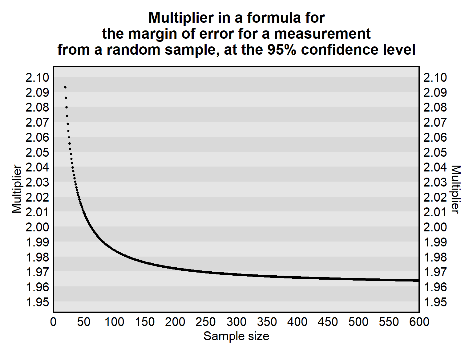 Tables are available online and elsewhere to determine the correct multiplier for a margin of error formula, but, for this course, you will be given or referred to the appropriate formula. As indicated in the plot below, for a margin of error at the 95% confidence level, the multiplier is close to 1.96 for relatively large samples.
