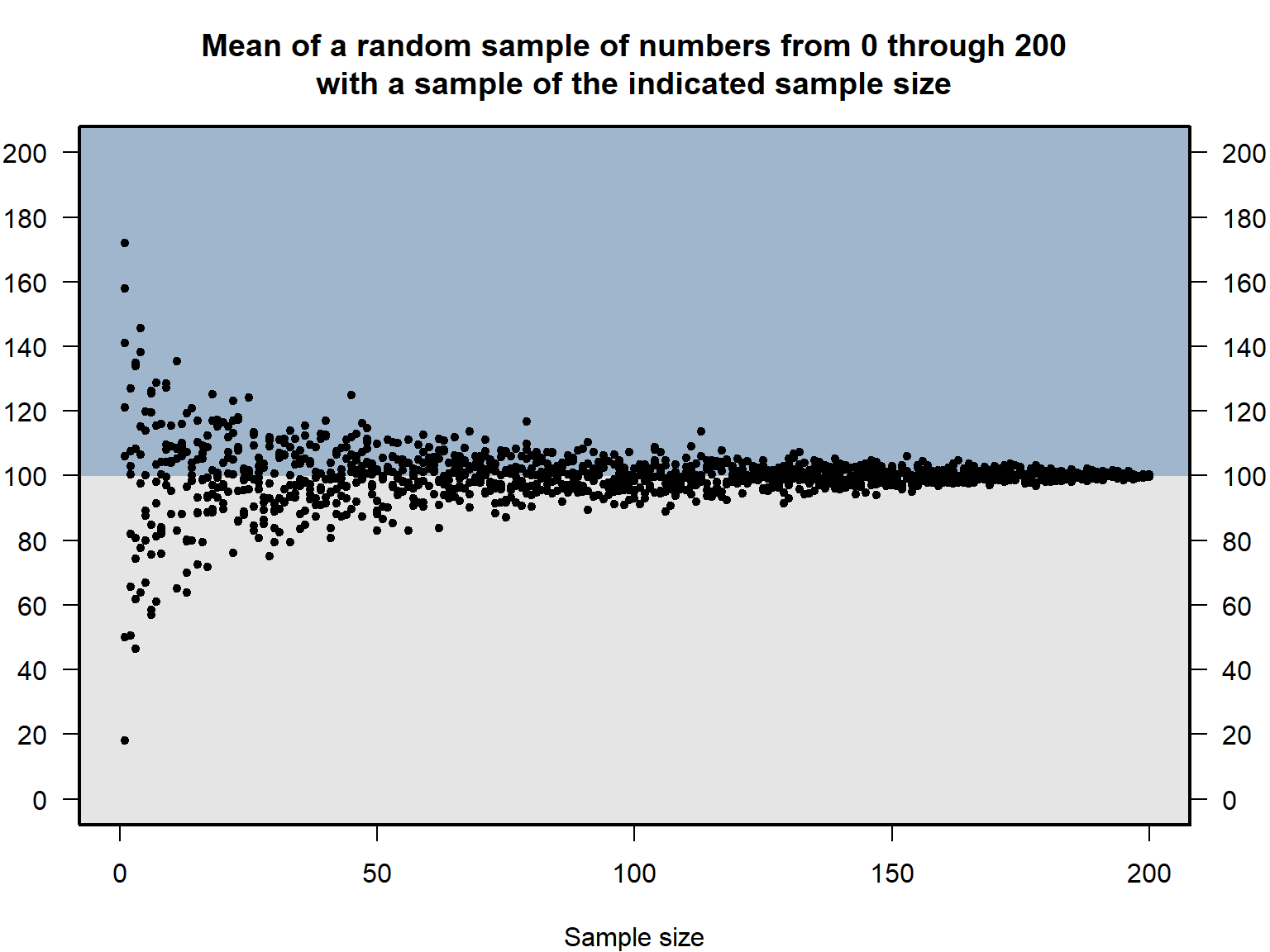 Let’s run a simulation to illustrate this. The population will be the set of whole numbers from 0 through 200, so the mean of the population is 100. The simulation will randomly draw numbers from this population and will calculate the mean of the sampled numbers. Some of the samples will be small (such as 2 or 3 sampled numbers) and some of the samples will be large (such as 100 or 150 or 200 sampled numbers). As the plot below indicates, compared to means for the smaller samples, the means for the larger samples tend to be closer to the population mean of 100.