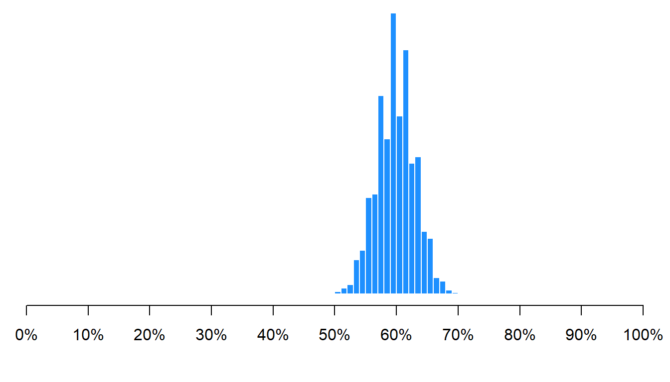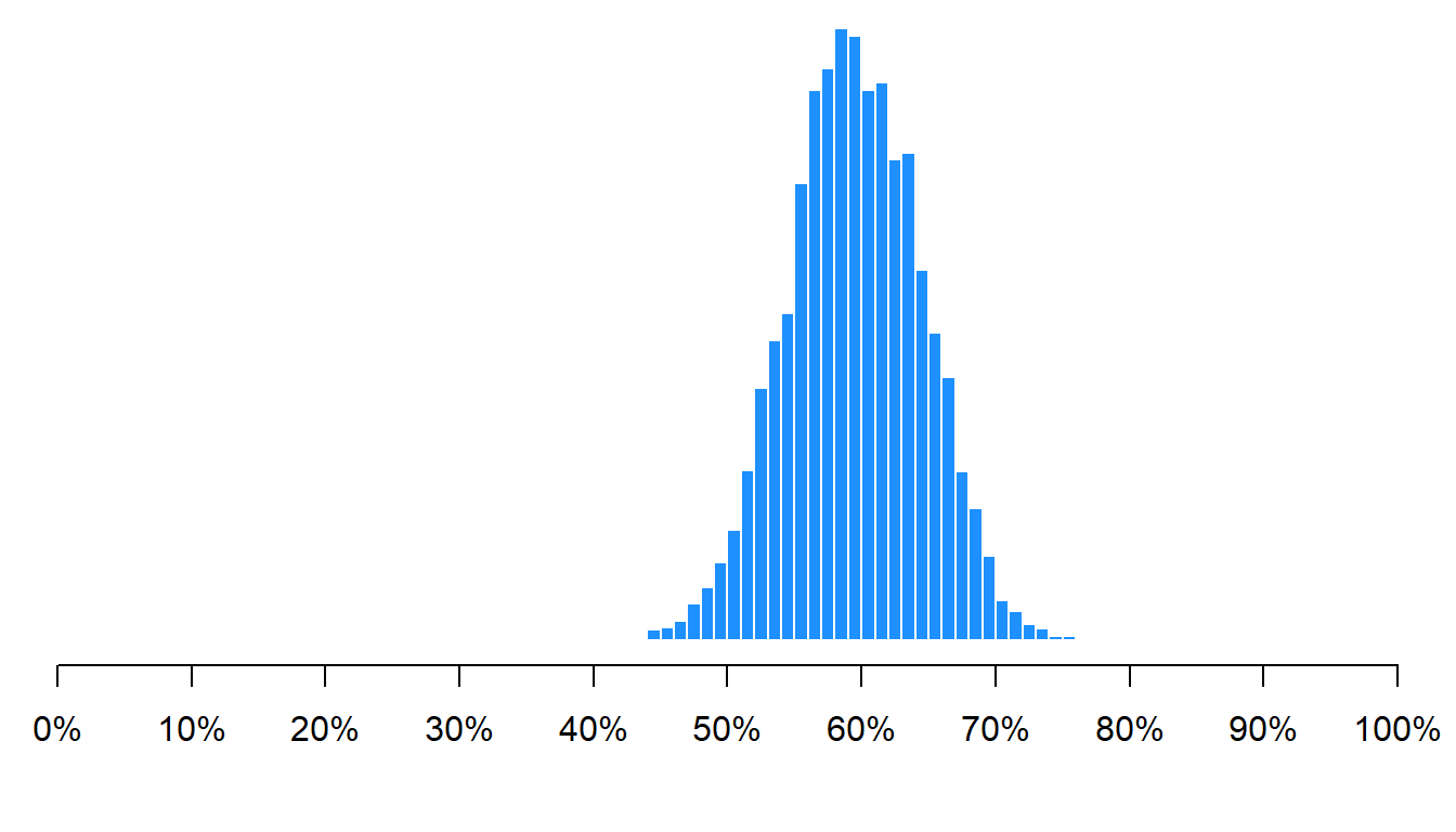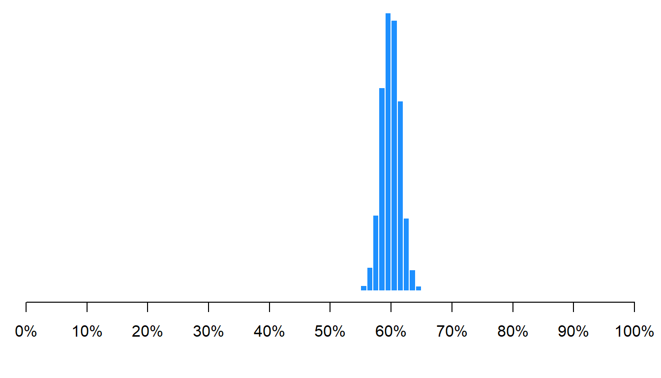 Let’s run a few simulations to show that, even with a large population, characteristics of relatively small samples can be expected to be relatively close to the true population characteristics. Let’s use a population that has 1 million people, of whom 600,000 are female and 400,000 are male, for a population that is 60% female and 40% male. This first simulation samples 100 of the 100 million people and calculates the percentage of the sample that is female. I’ll run the simulation 5,000 times and plot the 5,000 percentages female for each of the 5,000 samples: