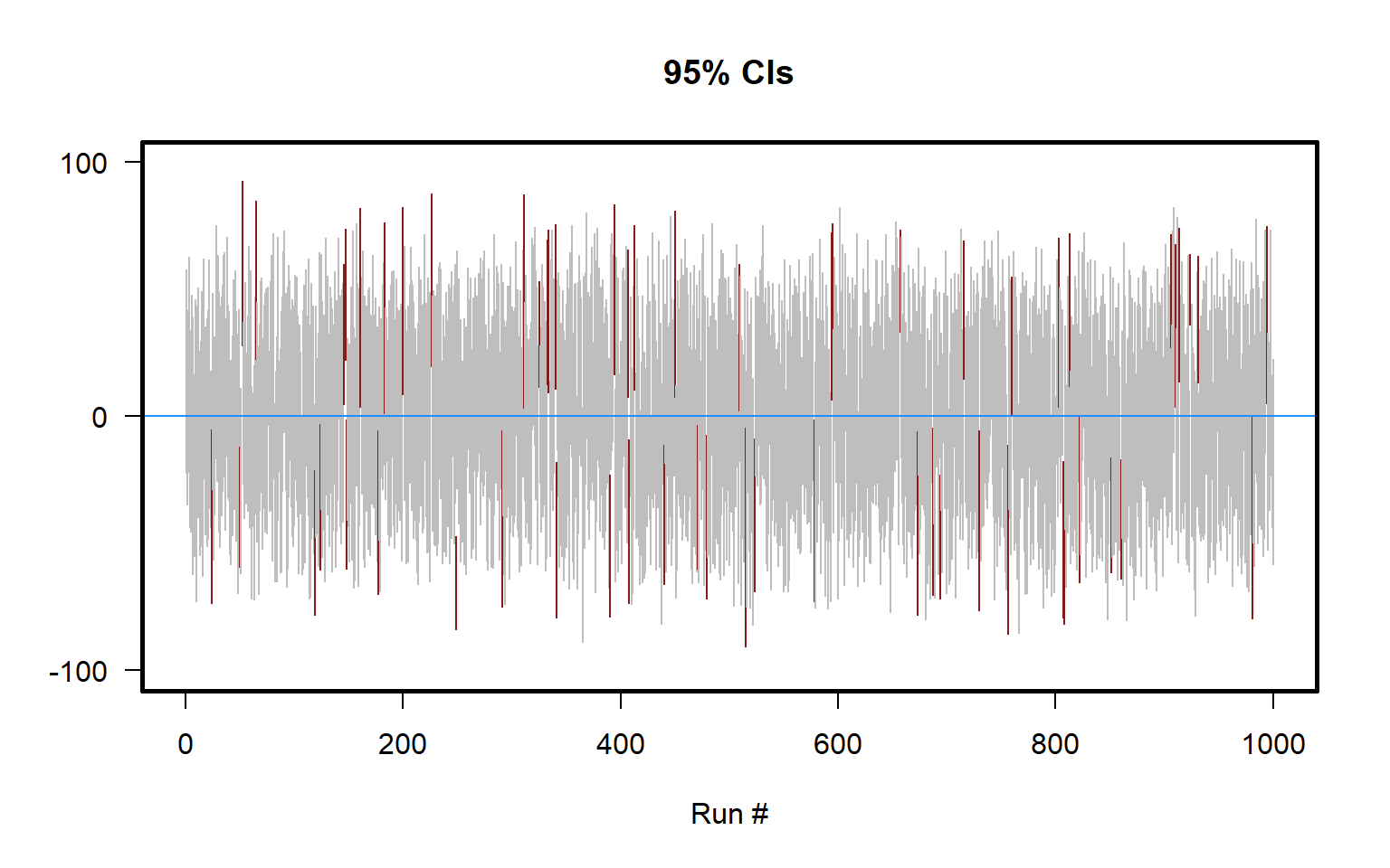 Let’s illustrate that with a simulation in the figure below, which plots 95% confidence intervals for samples of size n=10 drawn from a set of integers from -100 to +100. The 95% confidence intervals that contain the true population mean of zero are colored gray, and the 95% confidence intervals that do not contain the true population mean of zero are colored red. As illustrated in the plot, about 95 percent of the 95% confidence intervals contain the true population mean.