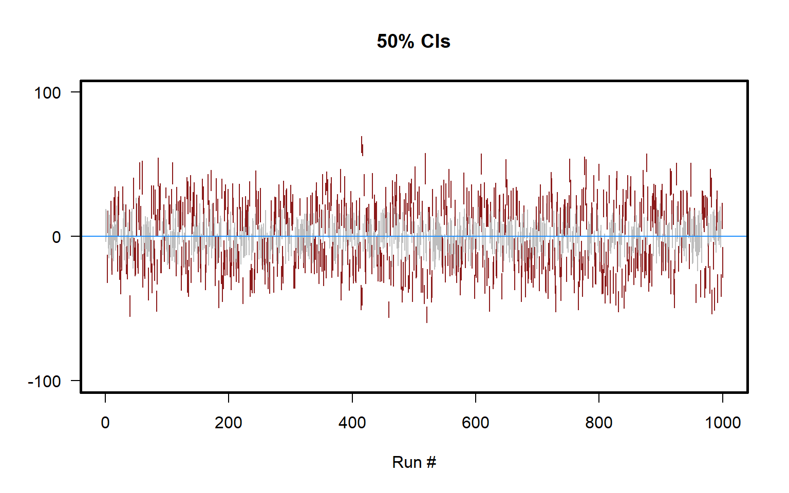 Below is a plot for 50% confidence intervals for the above situation of samples of size n=10 drawn from a set of integers from -100 to +100. The plot indicates that only about 50 percent of the 50% confidence intervals contain the true estimate (only about half of the lines are gray), and the plot also indicates that the 50% confidence intervals are not as wide as the 95% confidence intervals are for the same estimate.