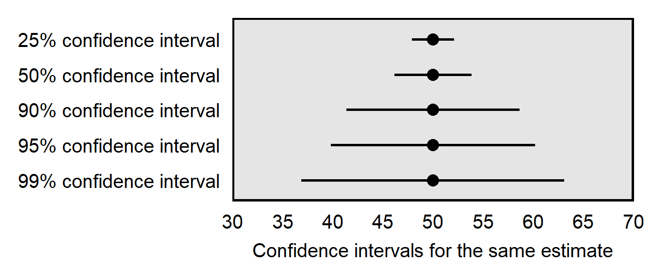 Below is a plot of different confidence intervals for 50 heads in 100 flips, illustrating how having a higher confidence level requires a wider range of estimates.