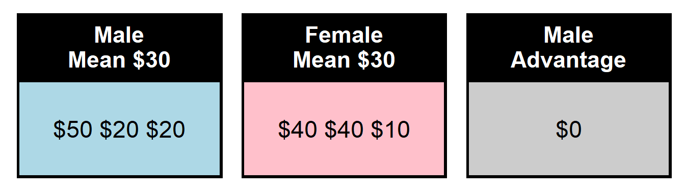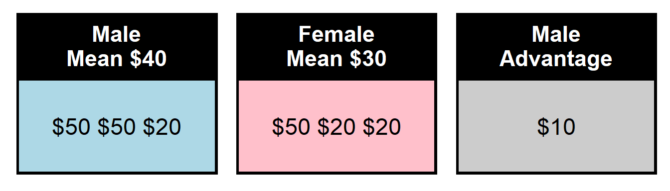 Statistical control can make an estimated difference smaller, make an estimated difference larger, or not change an estimated difference. Below is an example in which there is no gender gap in an analysis without statistical control – male workers make $30 on average, and female workers make $30 on average – but when controlling for time status – a gender gap appears, suggesting that female workers are unfairly paid less than male workers. Let’s start with the comparison without statistical control: