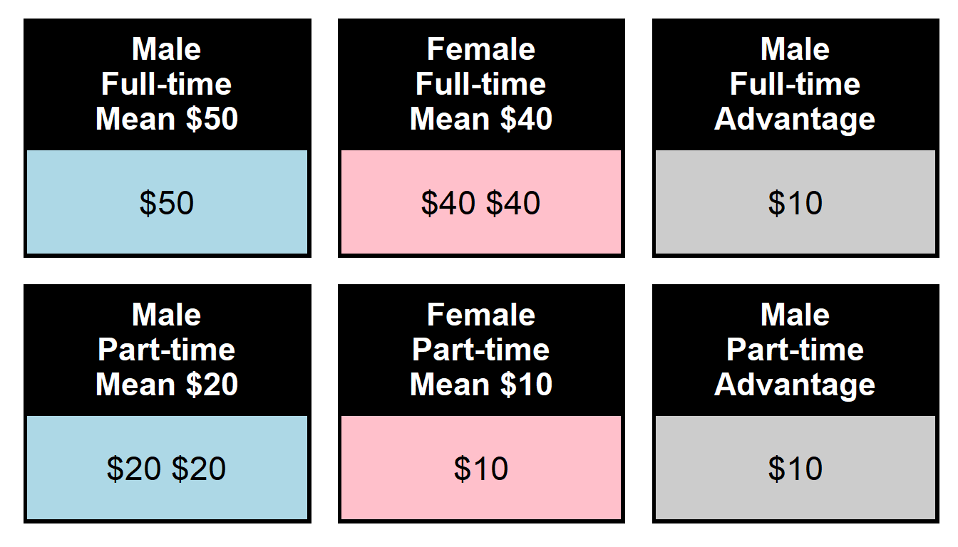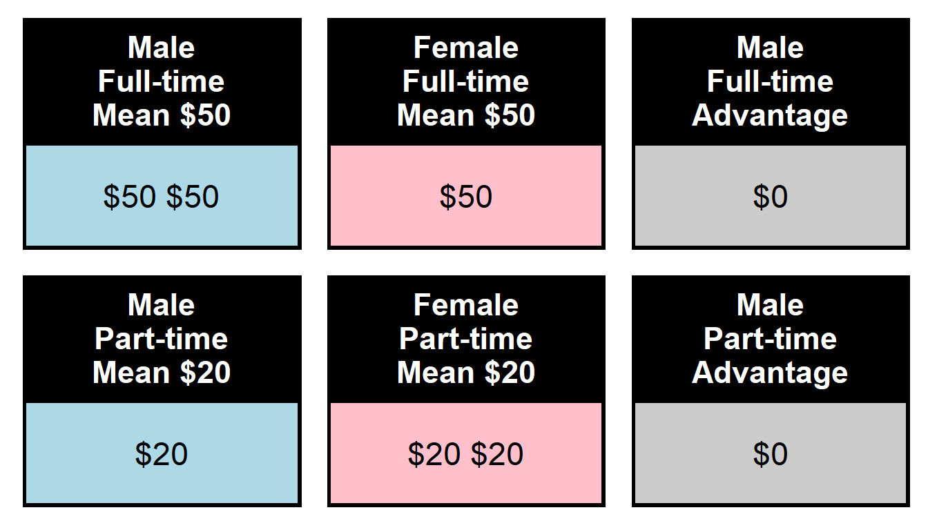 So when we compare the mean pay among male workers who work full-time to the mean pay among female workers who work full-time, there is no gap on average: both groups make $50 on average. And when we compare the mean pay among male workers who work part-time to the mean pay among female workers who work part-time, there is no gender gap: both groups make $20 on average. So – in the analysis without statistical control – the gender gap in pay favored men, but – when controlling for full-time/part-time status – there is no gender gap.