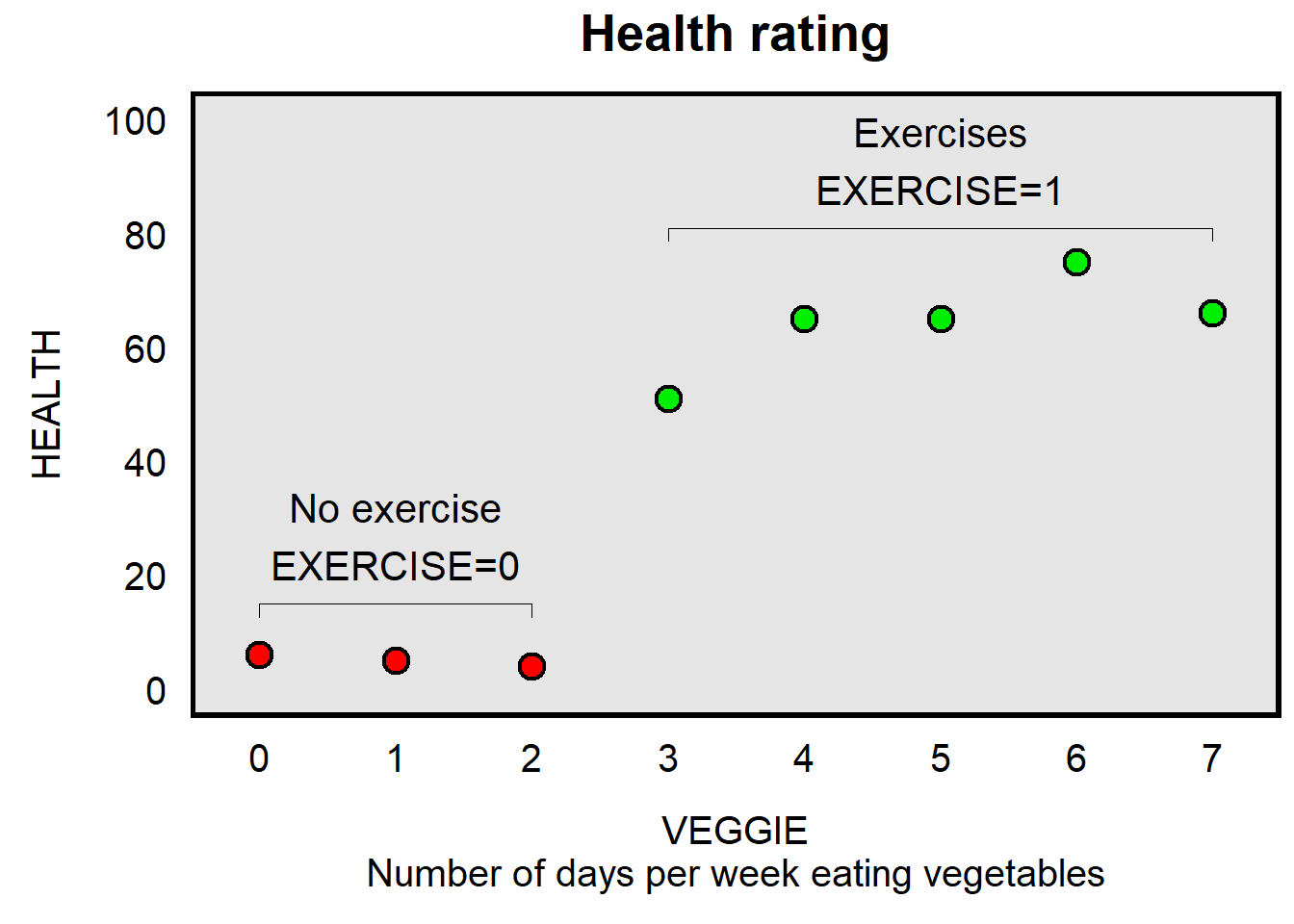 The plot below presents data for eight persons. The x-axis is VEGGIE, which indicates how many days per week that each of the eight persons eats vegetables, the y-axis is HEALTH, which indicates a rating about how healthy the person is, and the color of the dots indicates whether the person exercises, with a red dot indicating that the person does not exercise and a green dot indicating that the person exercises (with a variable called EXERCISE).