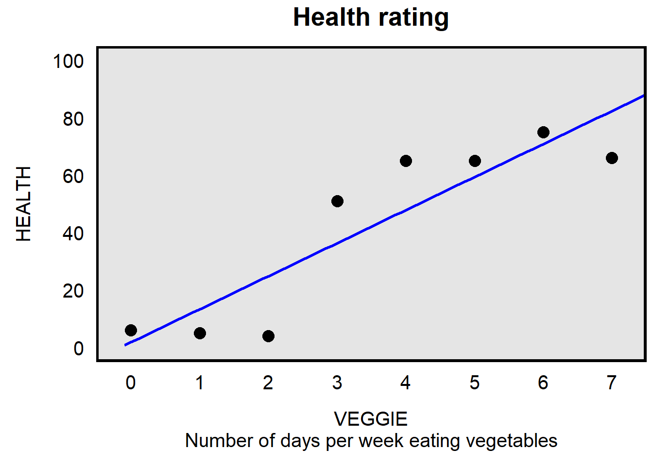 The output below is for the above linear regression. The constant/intercept coefficient of 1.83 is the y-intercept, which indicates the predicted value of the outcome HEALTH when the predictor VEGGIE is set to zero. This can be interpreted as indicating that, based on the linear regression, a person who eats vegetables zero times per week would be predicted to have a HEALTH rating of 1.83. The coefficient of 11.51 for VEGGIE indicates the slope of the linear regression line. This can be interpreted as indicating that, compared to persons who eat vegetables a particular number of days per week, a person who eats vegetables one more day per week is predicted to have a HEALTH rating that is 11.51 units higher.