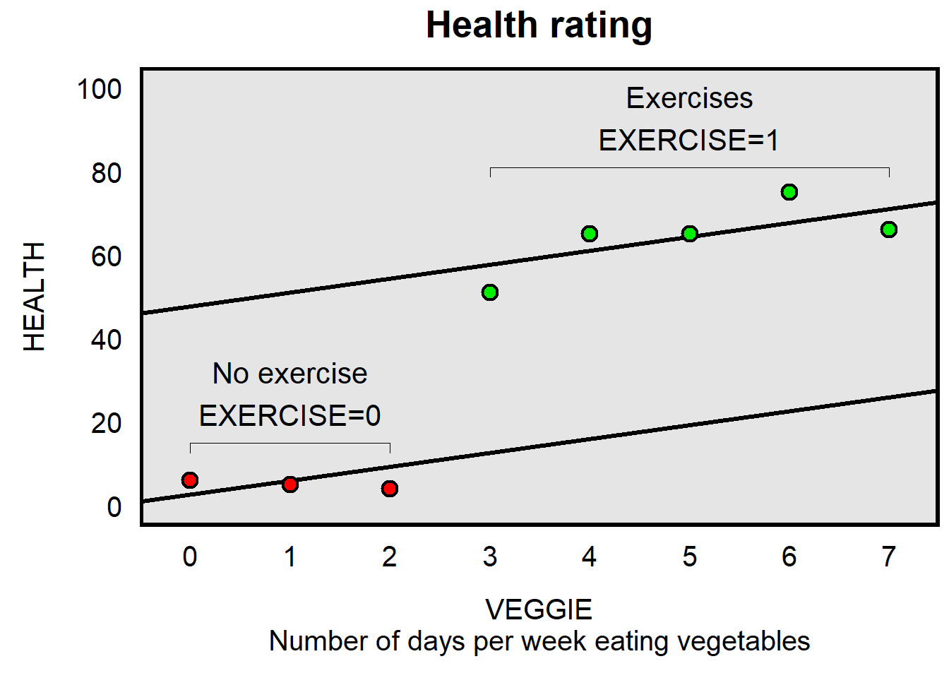 ------------------------------------------------------------------------------The original coefficient on VEGGIE was 11.51. But, for the above linear regression with a control for EXERCISE, the coefficient on VEGGIE decreased to 3.17. This decrease is because much of the observed association between VEGGIE and HEALTH can be explained by the fact that people who eat vegetables more frequently also exercise, and this EXERCISE variable predicts the HEALTH rating better than the VEGGIE variable predicts the HEALTH rating.