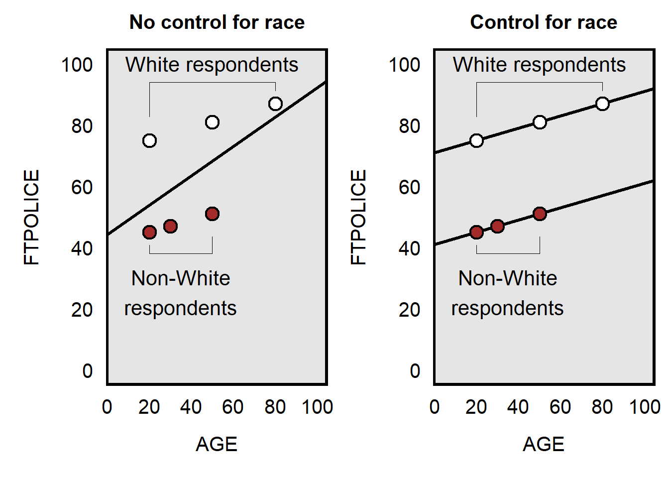 The control for respondent race addresses the alternate explanation that PARTY06 associates with FTPOLICE merely because of race. In the United States, Blacks are more likely to be Democrats than to be Republicans, so maybe the association between PARTY06 and FTPOLICE was merely because, compared to other people, Blacks are more likely to be Democrats and are more likely to rate police relatively low. The regression controlling for race indicates that the association between PARTY06 and FTPOLICE holds on average across racial groups.8.3 Illustration of the effects of statistical control