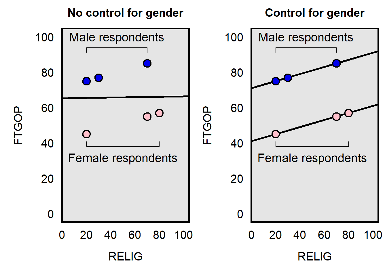 Let’s use a different stylized example to illustrate how adding statistical control can make a coefficient that is already in a regression be more extreme than the coefficient was before. For this example, we have three male respondents and three female respondents, with measures of respondent ratings about Republicans (FTGOP) and respondent religiosity (RELIG). As indicated below, a control for participant gender makes the coefficient for RELIG more extreme: the slope of the line of best fit for RELIG is 0.01 in the left plot but is 0.20 in the right plot.
